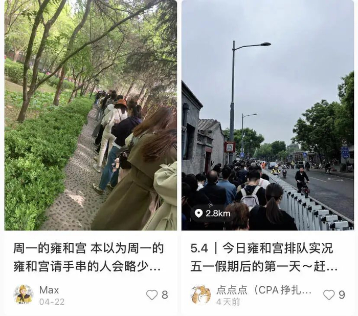 雍和宫五一期间每日接待人数超过2万人,在4月29日就售空了4月29日至5月2日期间的全部门票;灵隐寺在4月29日至5月3日期间延长开放一小时;五台山在五一期间开始限流,每天限游客 30000人、限车辆 2000辆……