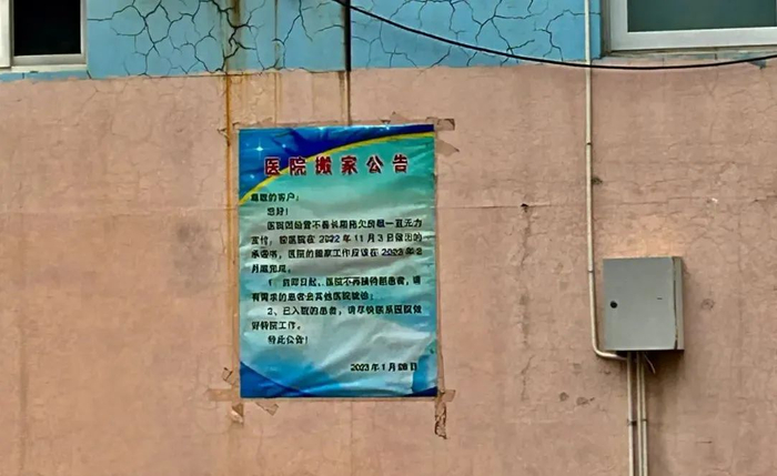 院区入口处张贴的一张“医院搬家公告”显示,医院因经营不善长期拖欠房租一直无力支付,搬家工作应在2023年2月底完成,自即日起,医院不再接待新患者、已入院的患者请尽快联系医院做好转院工作,公告的落款时间为2023年1月28日。