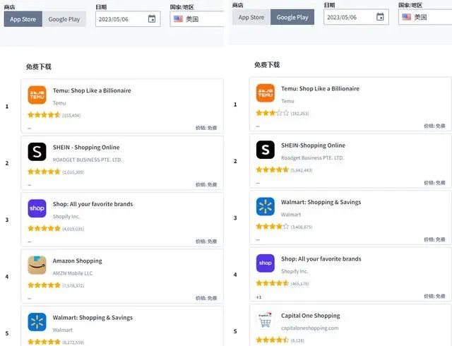 在购物领域,来自中国的平台依然最受追捧。在第三方机构SensorTowe今日(5月6日)公布的每日排行榜上,Temu和SHEIN的app牢牢占据着美国苹果、谷歌两大渠道免费下载榜的头两把交椅;在苹果商店中,亚马逊app位居第四位。