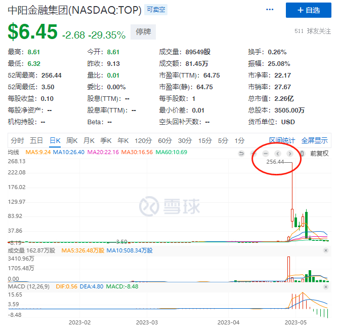 几天之后,5月4日中阳金融股价突然跳水79.39%,此后一路下跌,到目前只剩下2.26亿美元的市值。
