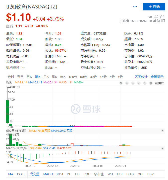 见知教育从最高点186.01美元一股,下跌到1.1美元一股。