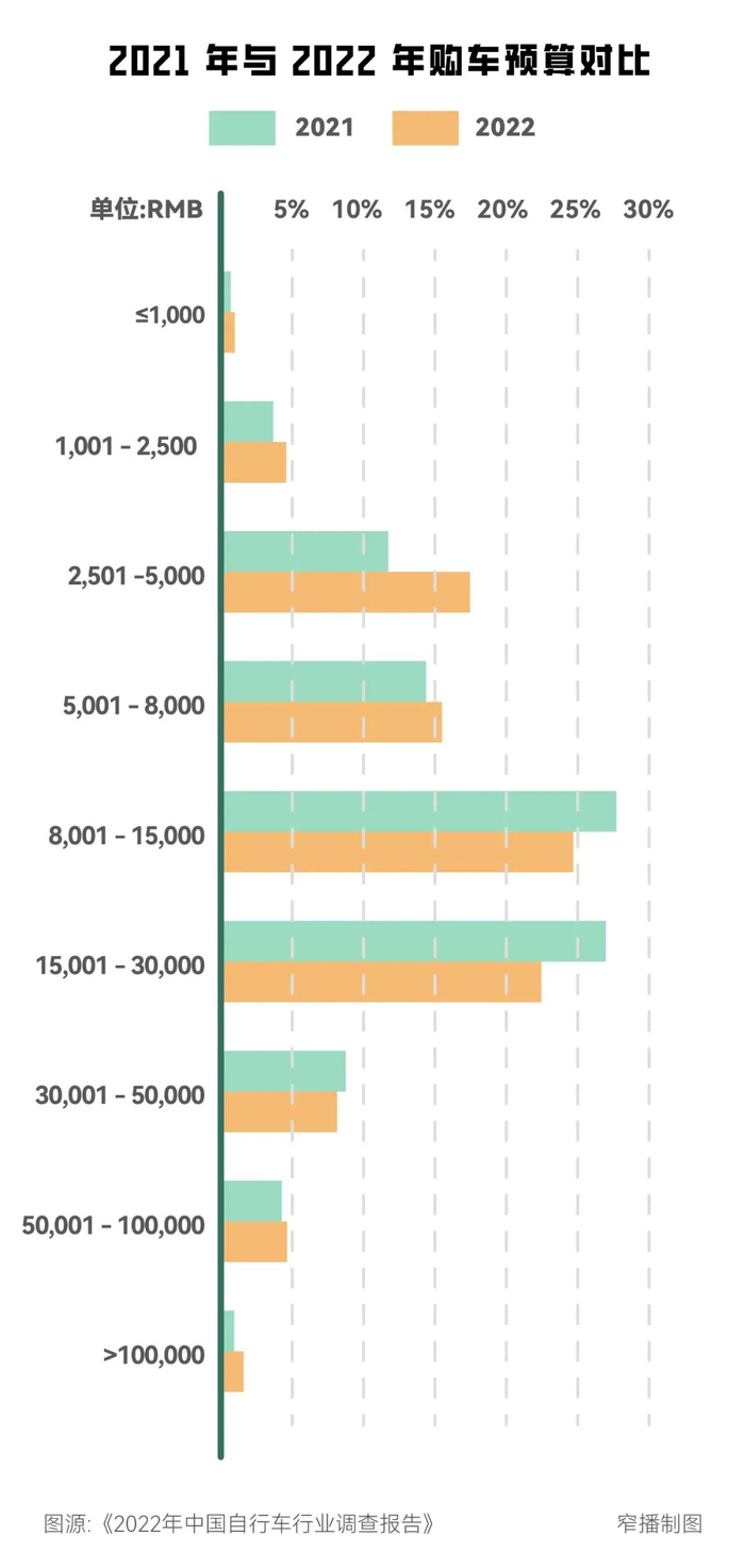 近两年的骑行车热潮主要由一、二线城市用户推动,他们也是中高端自行车消费的主力军。《2022年中国自行车行业调查报告》显示,万元级别自行车最受欢迎,8001-15000元区间占比最大,为24.92%;其次是15001-30000元区间,为22.4%。