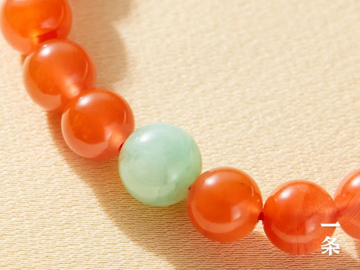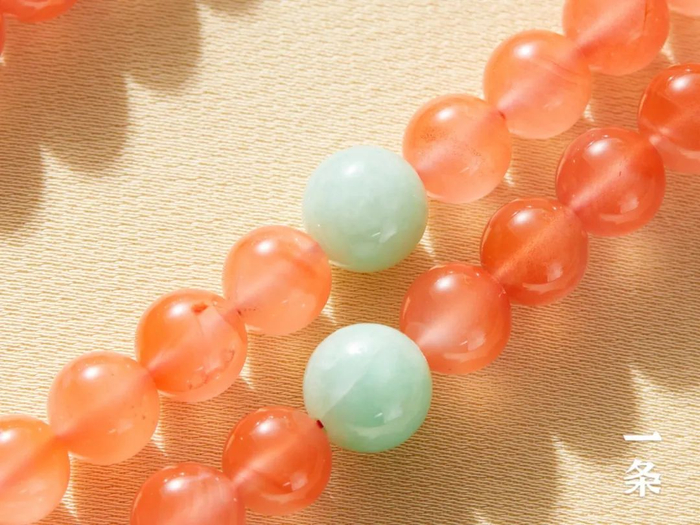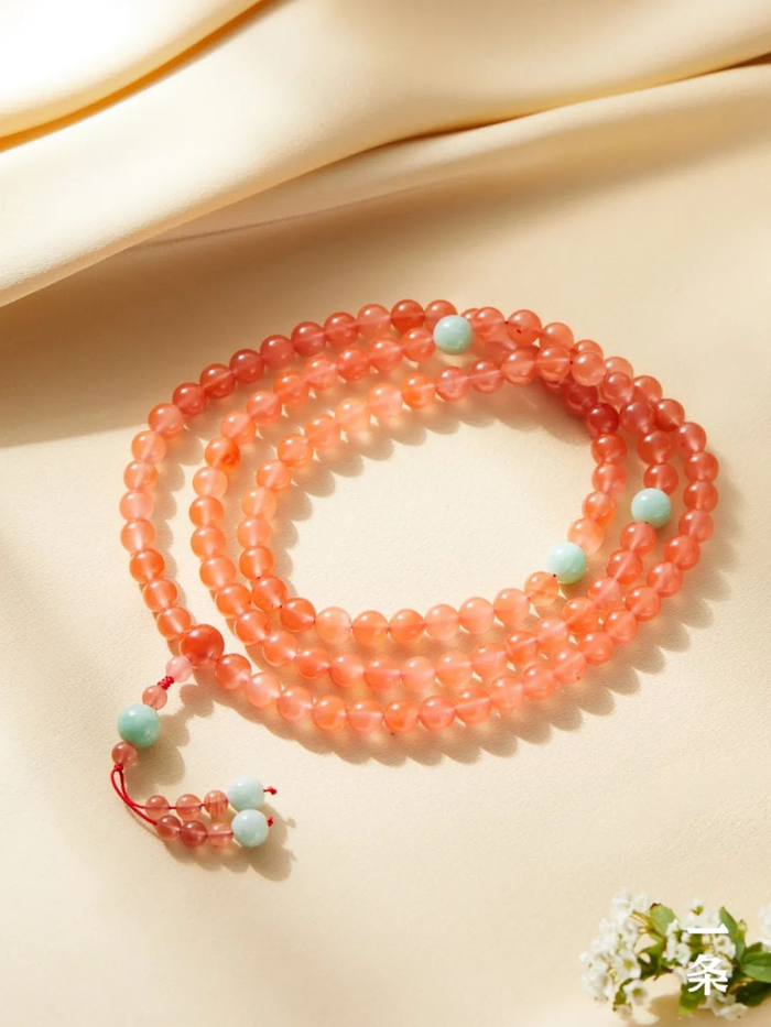 樱桃红108子,点缀翡翠圆珠,艳丽却不俗气,甜而不腻,嫩而不浮。