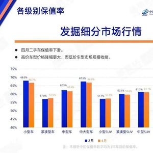 其中小型车保值率由3月的68%下降到66.7%,中型车保值率由3月的62.3%下降到61.6%,中大型车保值率由3月的67.5%下降到66.9%,紧凑型SUV保值率由3月的60.1%下降到59.6%,中型SUV保值率由3月的61.3%下降到61.1%,中大型SUV保值率由3月的70.7%下降到69.9%,MPV保值率由3月的60.9%下降到60.2%。