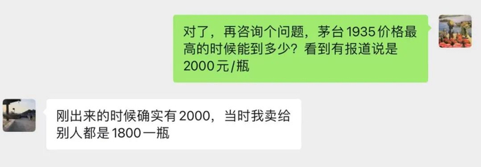根据媒体报道,在“茅台1935”正式上市后,曾经受到过热炒,市场价格冲到最高峰的时候能卖到2000元/瓶。有业内人士在回复懂酒谛的市场调研时说,在当时,如果按照1800元/瓶的价格出货,成交还是比较容易的。