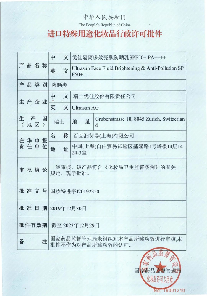 注:本品拥有进口特殊用途化妆品的许可批件,类别为防晒类,批准文号为国妆特进字J20192350。
