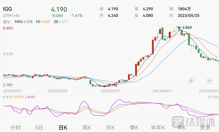 IGG自4月下旬以来股价一直在走下坡路,截至今天港股收盘,公司股价报收4.19港元,跌1.41%,成交额1804.27万港元,当前IGG总市值为50.2亿港元。