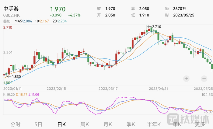 中手游自5月19日开始便出现下滑,至今已连跌连续5个交易日,股价累计跌幅达到15.27%。截至5月25日港股收盘,公司股价报收1.97港元,跌4.37%,成交额3670.08万港元,当前公司总市值为54.23亿港元。