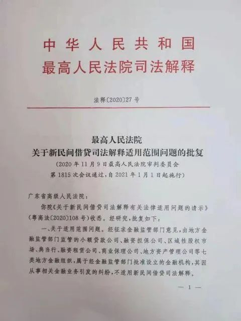 最高法院于2020年12月29日关于新民间借贷司法解释适用范围问题批复广东高院,明确:由地方金融监管部门监管的小额贷款公司、融资担保公司、区域性股权市场、典当行、融资租赁公司、商业保理公司、地方资产管理公司等七类地方金融组织,属于经金融监管部门批准设立的金融机构,其因从事相关金融业务引发的纠纷,不适用新民间借贷司法解释。其他问题已在修订后的司法解释中予以明确。批复自2021年1月1日起施行。