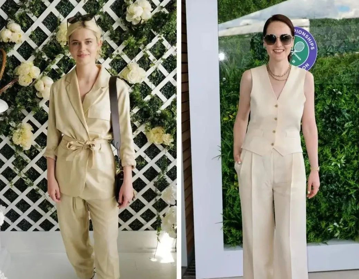 看温网的名人里,常见大面积的香槟、米白色系,这种全身统一颜色的穿法非常容易显高级,即便日常穿也会很加分。
