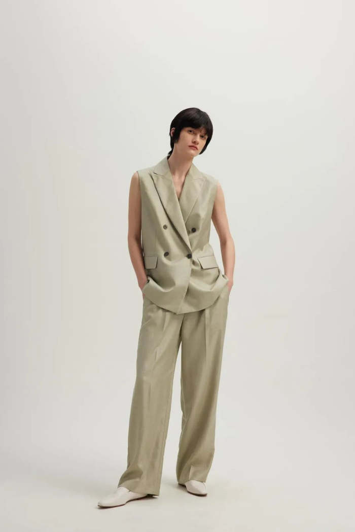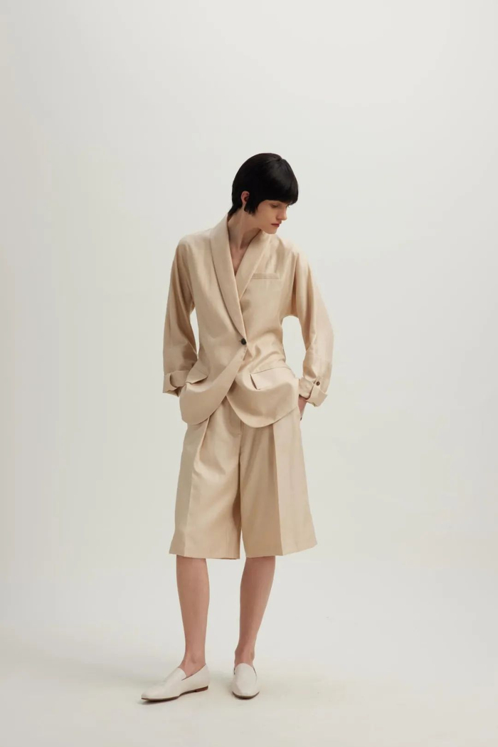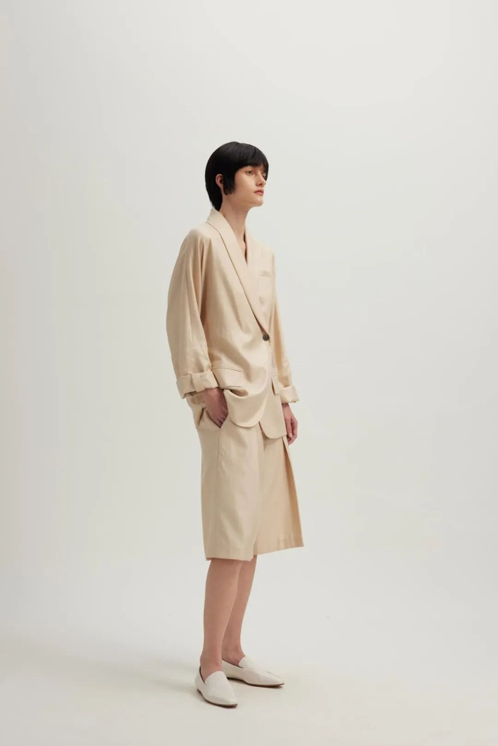 得益于精纺亚麻、桑蚕丝和羊绒的比例,它呈现出一种无可挑剔的质地:既有亚麻的垂顺硬挺,又有真丝的细腻光泽和高贵属性,还有羊绒亲肤柔软恒温的特性,穿上之后就完全不想脱下来了~