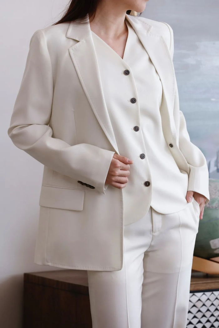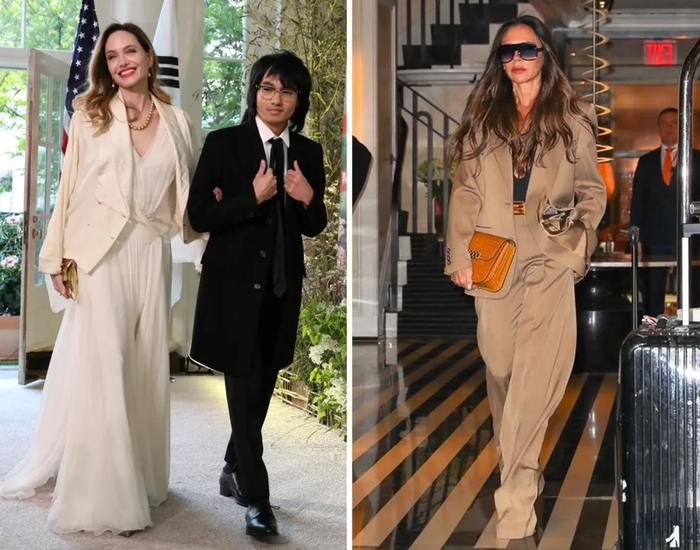 白色系就更万能了,像AA这样和米黄色西装叠搭,从头到脚写满贵气。这种奶油色系既足够实穿,在隆重场合也不跌份儿,因为明度较高,还衬得肤色干净、气质亲和,很容易给人留下家境优渥、专业得体的好印象。