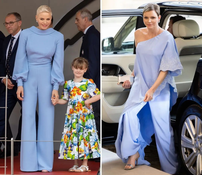 特别是蓝、白、灰、米色系,这类浅色也是王室名流夏天的最爱。摩纳哥夏琳王妃最近就常穿浅蓝色,温柔又清新↓