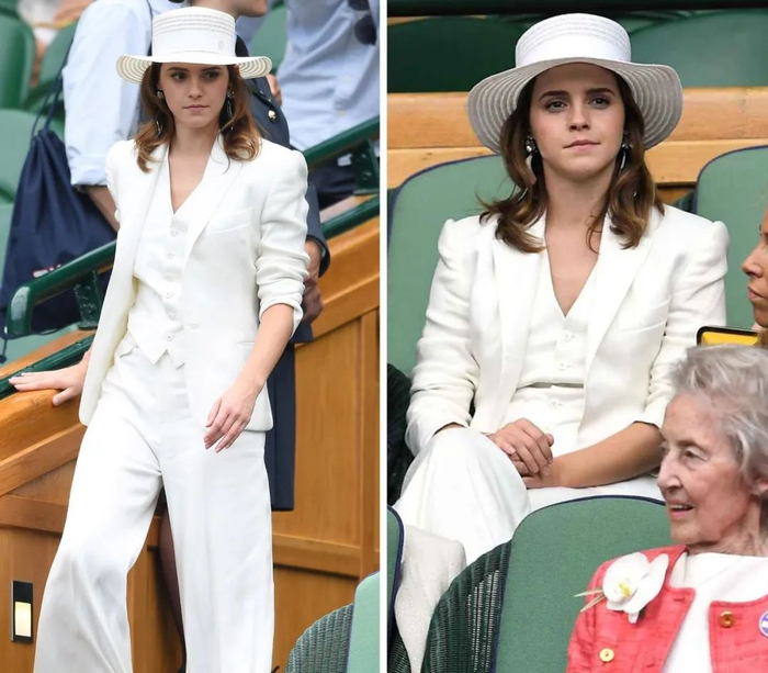 艾玛·沃森在温网观众席这身也是如此,西装马甲三件套修饰得身材比例匀称修长,贵气感不言而喻。