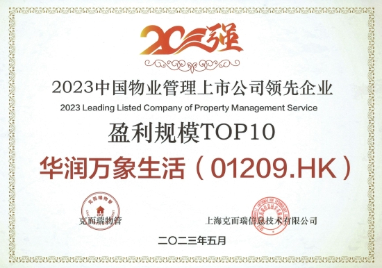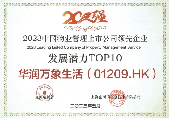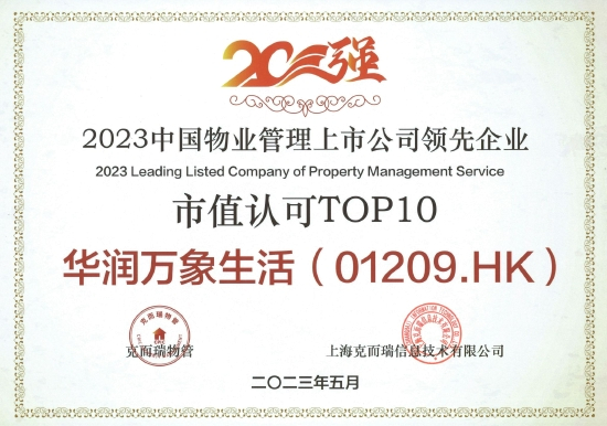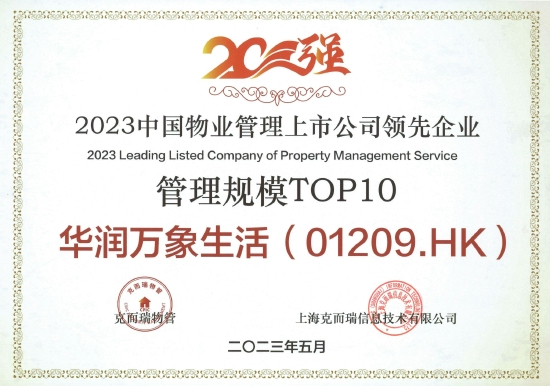 在「2023物业服务企业上市公司研究成果」中,华润万象生活荣获“2023中国物业管理上市公司20强”、“2023中国物业管理上市公司领先企业营收规模TOP10”、“2023中国物业管理上市公司领先企业盈利规模TOP10”、“2023中国物业管理上市公司领先企业管理规模TOP10”、“2023中国物业管理上市公司领先企业市值认可TOP10”、“2023中国物业管理上市公司领先企业发展潜力TOP10”以及“2023中国物业管理上市公司领先企业高质量发展TOP10”奖项。