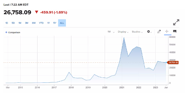 后来美元进入快速加息、缩表周期,比特币泡沫破裂,一度下跌至16000美元附近。最近比特币反弹到27000美元附近,跟美元加息接近尾声,全球股市普遍反弹有关系。