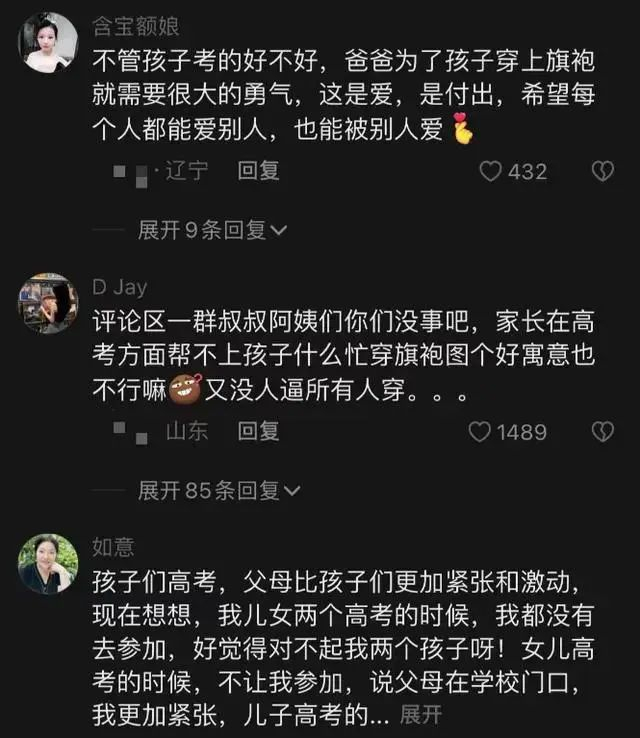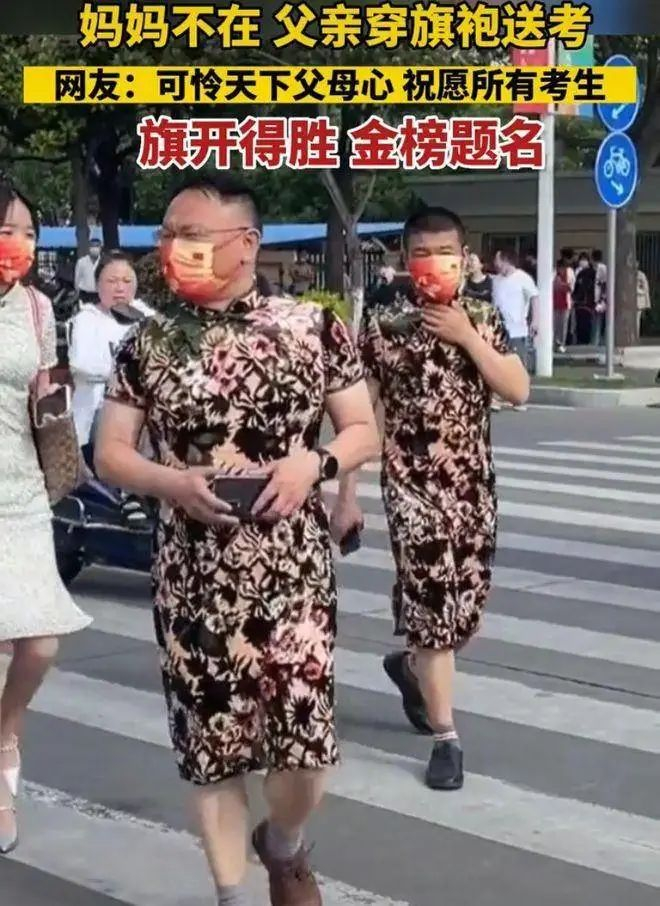 当然,考场外更多的是旗袍——记得当时有一则冲上热搜的新闻,安徽阜阳,高考首日,当天妈妈赶不回来,无法陪孩子参加高考,爸爸赶紧去服饰店买了一件旗袍穿上,为孩子加油打气。