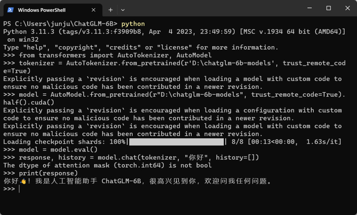 from transformers import AutoTokenizer, AutoModel tokenizer = AutoTokenizer.from_pretrained(r"D:\chatglm-6b-models", trust_remote_code=True) model = AutoModel.from_pretrained(r"D:\chatglm-6b-models", trust_remote_code=True).half().cuda() model = model.eval() response, history = model.chat(tokenizer, "你好", history=[]) print(response)