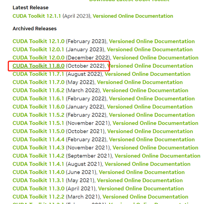 在 Nvidia 官网 下载 11.8 的 CUDA Toolkit Archive。