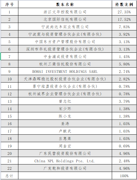 此次拍卖公告显示,文盛资产有共计22家/名股东,相当分散。不过周智杰作为浙江文华的实控人,最终享有文盛资产30.9689%的权益。