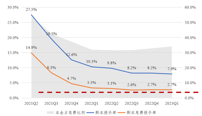 其次是个贷不良处置操作简单,收益比价稳定。从本金占息费比例、剩本报价率、剩本息费报价率等多个数据分析来看,个贷价格尚未触底,还有可降空间。