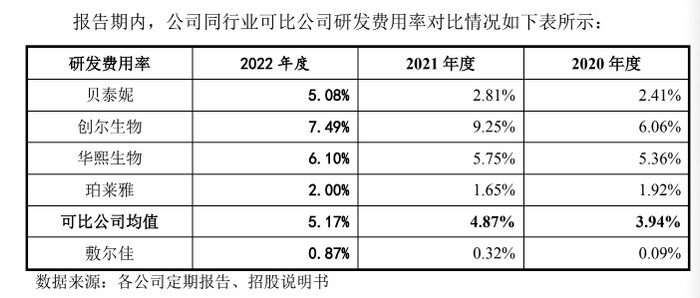 2022年,创尔生物研发费用率达到7.49%,华熙生物则达到6.10%。