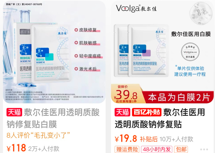 “械字号”的医用透明质酸钠修护贴,与“妆字号”的透明质酸钠修护膜,两者包装外观极其相似