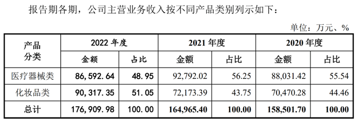 招股书显示,2022年敷尔佳化妆品产品销量第一次超过医疗器械类产品,增幅达32.29%。
