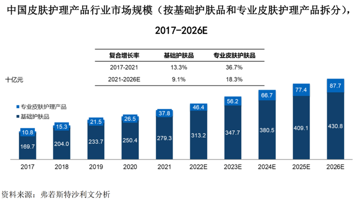 根据咨询公司弗若斯特沙利文(Frost & Sullivan)的数据,2017年至 2021 年,中国皮肤护理产品行业市场规模由 1805 亿元增长至 3171 亿元,年复合增长率为 15.1%。预计到 2026 年,中国皮肤护理产品行业的市场规模将达 5185 亿元。