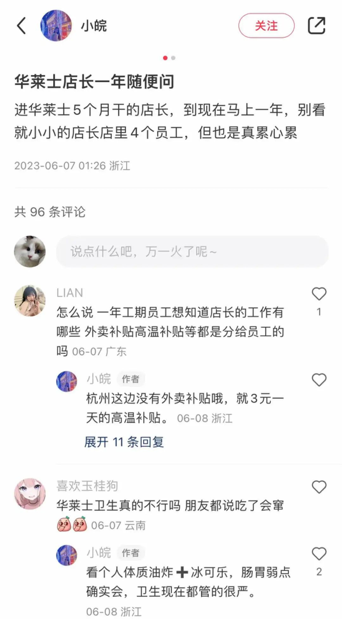 租金省了、原料省了,人工也是能省则省。据氢商业观察,社交平台上分享的华莱士工资时薪多聚集在10-17元/小时这个区间。在大学附近华莱士打工的小江可以拿到12元/h,在乡镇华莱士打工的小胡只有10元/h。每个门店忙活的的人大概也就4、5个,这意味着每个人都得是全才,收银、帮厨啥都得会干,高负荷运转。