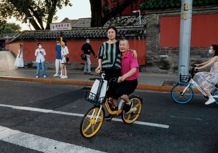 2022年7月6日,北京。一对夫妇在鼓楼西大街骑着共享单车。(图/视觉中国)
