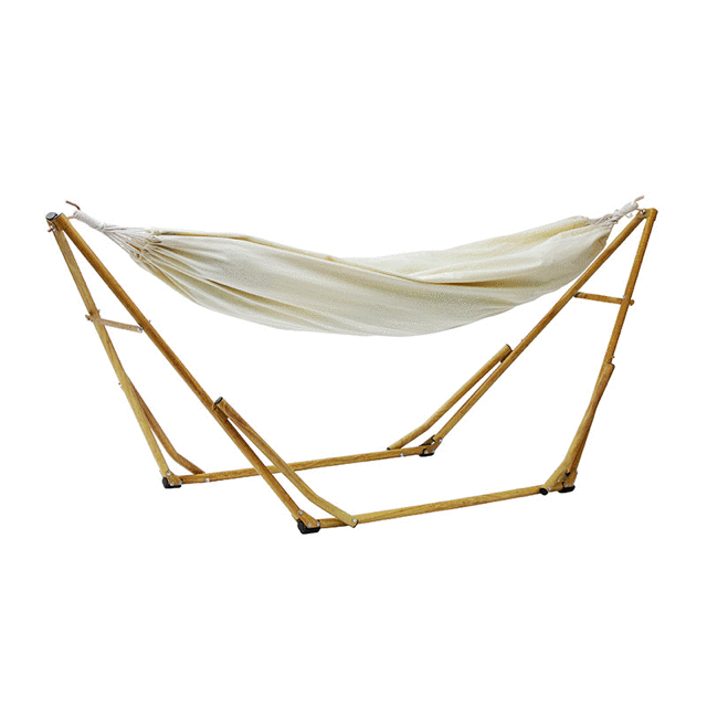 简约的木色框架,搭配上米白色的吊床布,像一艘小船,搭乘着初夏的微风,在丛林中荡漾,不经意间就穿梭到了小时候的夏日回忆。