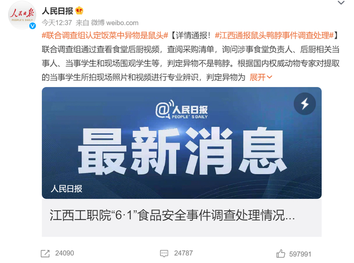 学生在食堂里吃出一个鼠头,竟然逼出江西省教育厅、省公安厅、省国资委、省市场监督局四部门联合调查,才最终确定:不是鸭脖,而是鼠头!
