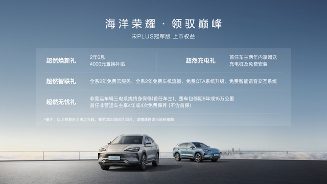 6月19日,比亚迪海洋网重磅冠军车型——宋PLUS冠军版正式上市,其中宋PLUS DM-i冠军版共4款车型,售价15.98万元-18.98万元,宋PLUS EV冠军版共4款车型,售价16.98万元-20.98万元。同时为用户准备了2年0息、置换补贴、充电桩、首任车主非营运车辆三电终身保修等多项购车好礼,让冠军产品惠及更多用户。