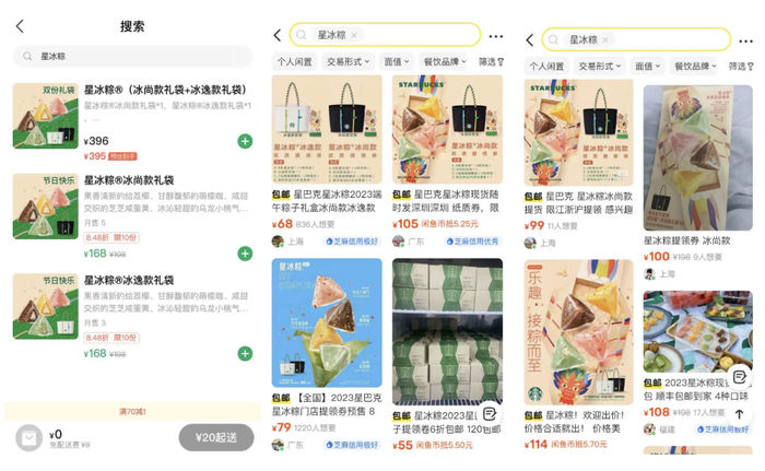 但从消费者这端看,星冰粽相当好买,走进星巴克门店,或点开外卖软件,都能以低于标价的价格拿下一盒,如果到海鲜市场闲鱼兜一圈,更是什么价位都有,最低可至三折。