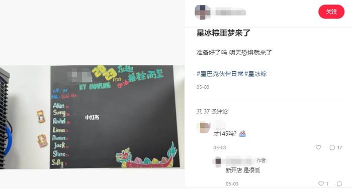 5月3日,星冰粽开售前,有店员发小红书写道:“星冰粽噩梦来了。”配图中有一块黑板,上面写着门店总目标145,也写着摊到每位“伙伴”头上的指标。