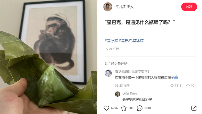 木木2019年在星巴克做学生兼职,她说,自己所在的门店不在热门商圈,正职员工就3、4个,看不出对推销星冰粽有什么压力,“感觉只有店长在惆怅”。