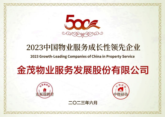 在「2023中国物业服务企业综合实力研究成果」中,金茂服务荣获“2023中国国有物业服务企业综合实力10强”以及“2023中国物业服务成长性领先企业”奖项。