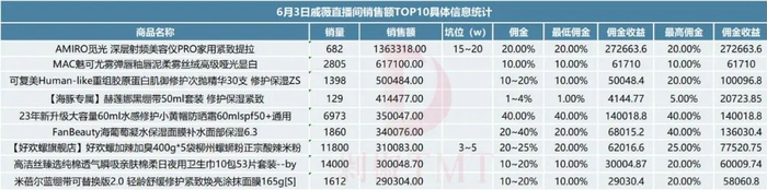 根据一些业内人士的实际反馈,以戚薇直播间卖的最好的6月3日为例,剁主统计销售额前十名,除去运营成本、话费补贴(联通、移动、电信)、投流成本,戚薇能赚得400多万。尤其是美妆品类,基本都是高货值、高利润的品。