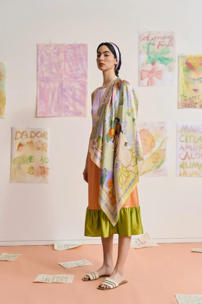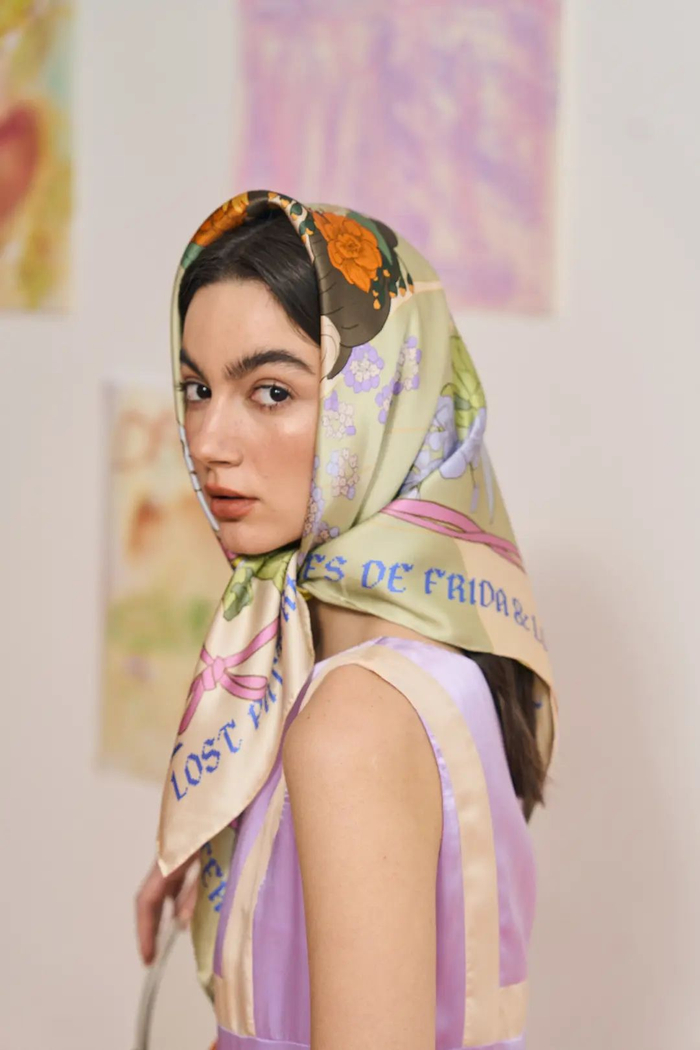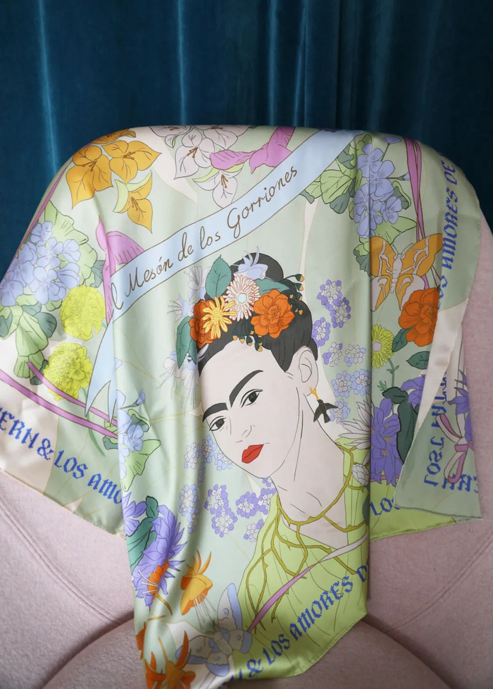 首先推荐的,就是这款弗里达画像真丝大方巾了~整体是清新的浅绿色,搭配各种花卉图案夏日感十足,经典自画像自带艺术气息~