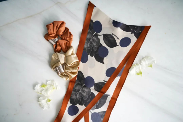 丝巾采用100%桑蚕丝制作,精致卷边加丝网印刷,质感相当高级。上面的双成记logo也非常清晰有个性。当作丝巾或是包裹包包手柄都很合适,甚至还可以当作头巾来戴,妥妥一物多用。