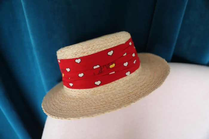 如果你喜欢田园法式风格,这款桃心平顶草帽一定能戳中你的心,它搭配了一条非常可爱的红色桃心饰带,热情洋溢的红色给人眼前一亮的感觉。