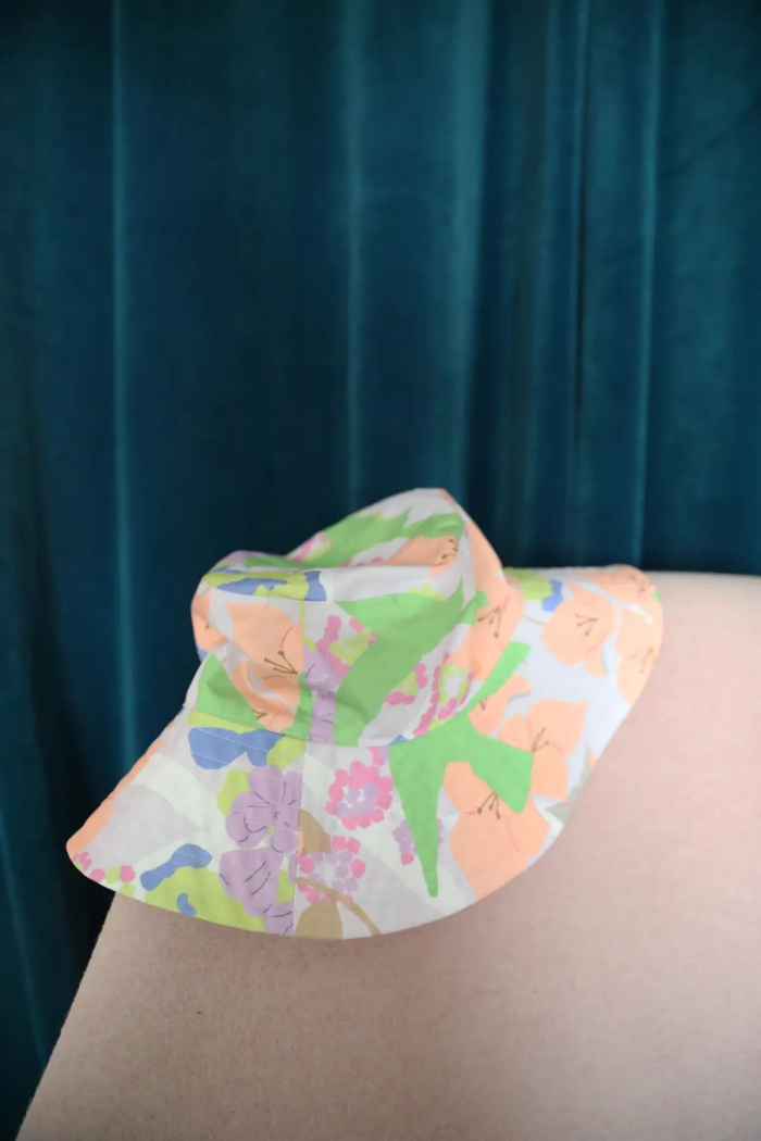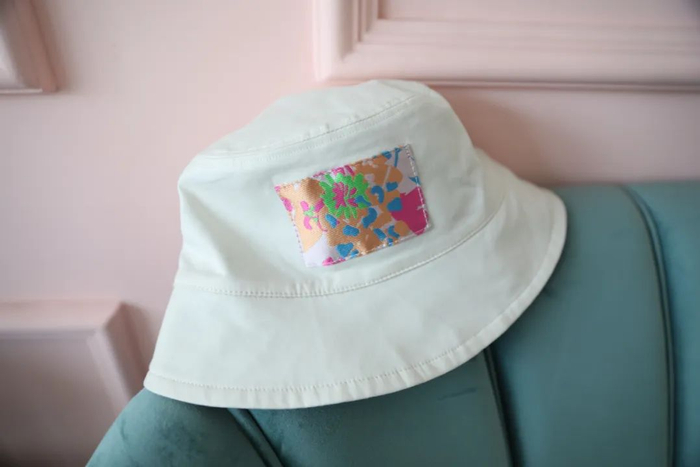 这顶花花印花渔夫帽上有原创的手绘印花图案,鲜明的色彩碰撞,非常有夏日风情。