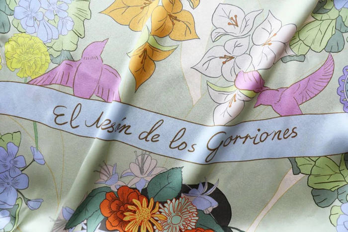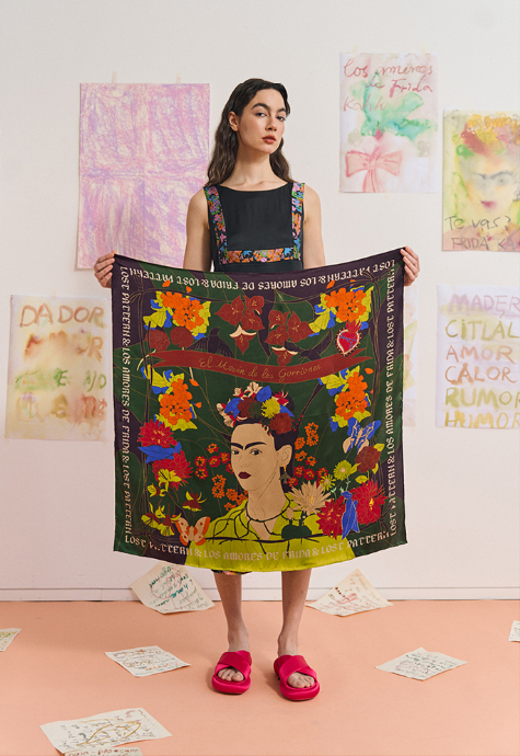 这款弗里达花园中方巾设计也很清新。图案灵感汲取自弗里达喜欢的墨西哥传统三角梅、 大丽花、金盏花和栀子花等,配色明亮,充满墨西哥风情。