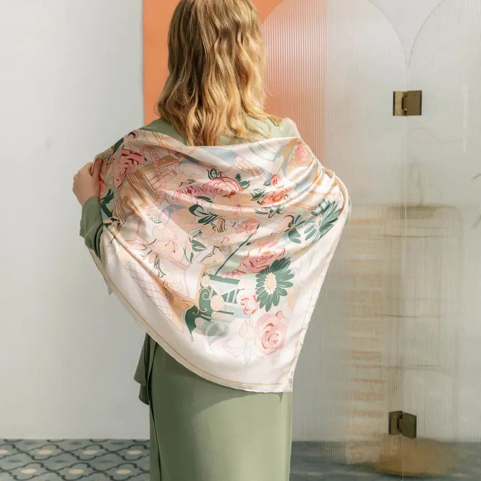 方巾采用100%桑蚕丝制成,手感柔和顺滑,垂坠感也很自然,珍珠般的光泽质感十分高级。
