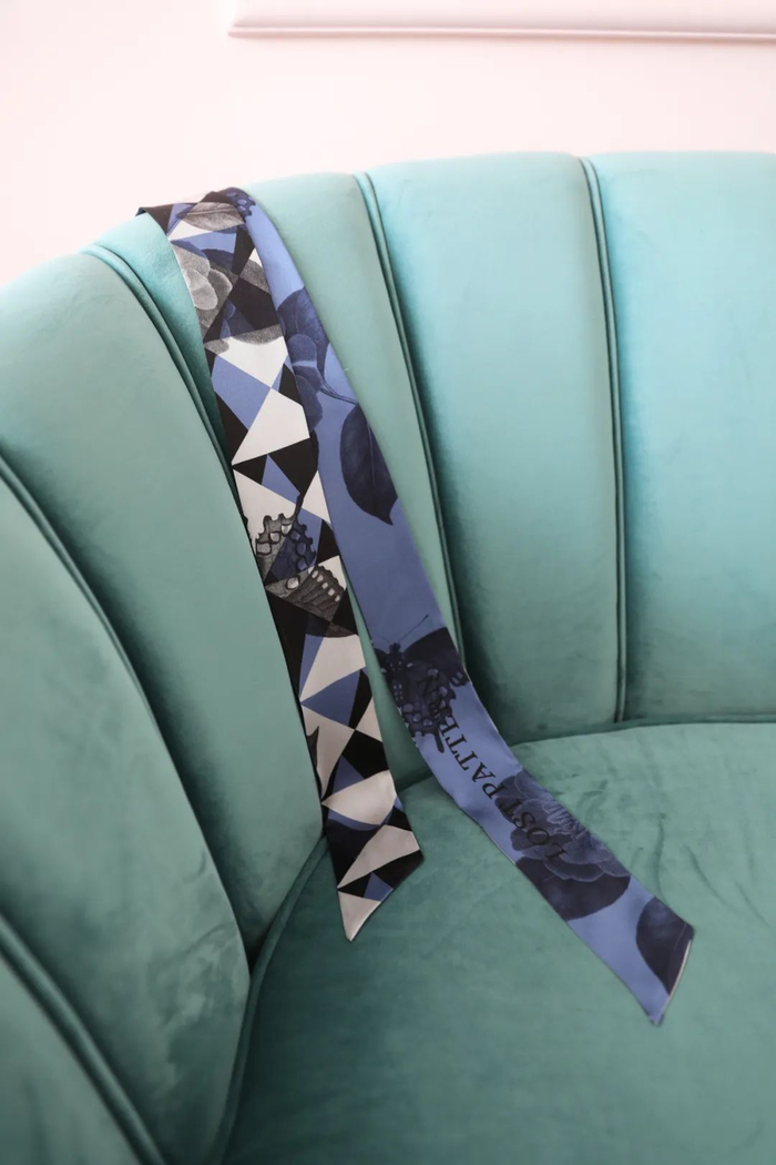 玫瑰图鉴缎面窄丝巾 蓝色