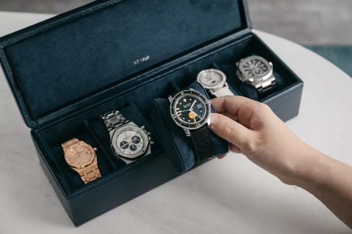 里面可以放下5块腕表,男女表都合适,深蓝色绒面内衬,很显质感。表枕小巧饱满,也很实用,就算是大表盘的腕表,同样能放下~