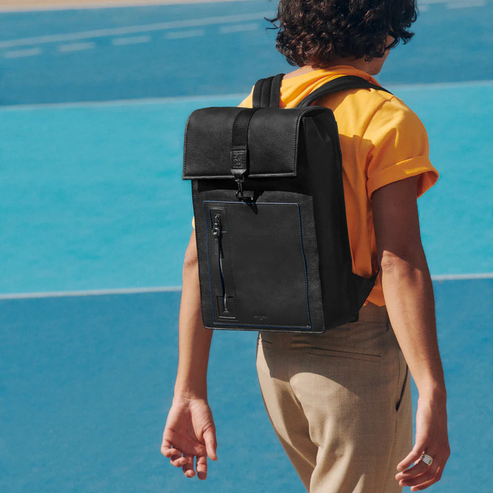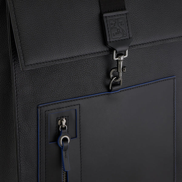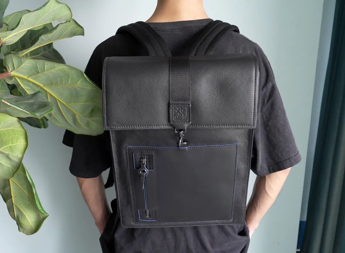 双肩包采用全粒面牛皮制成,正面还搭配了一个平口袋,方便装一些证件等需要伸手即拿的物品,口袋的边缘、拉链上还有蓝色细节点缀,低调中透露着儒雅和精致。