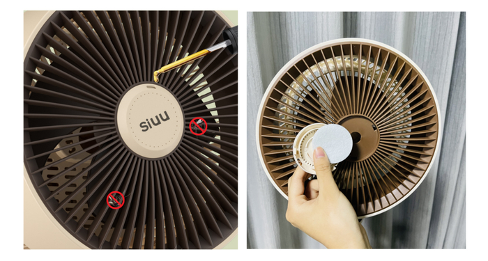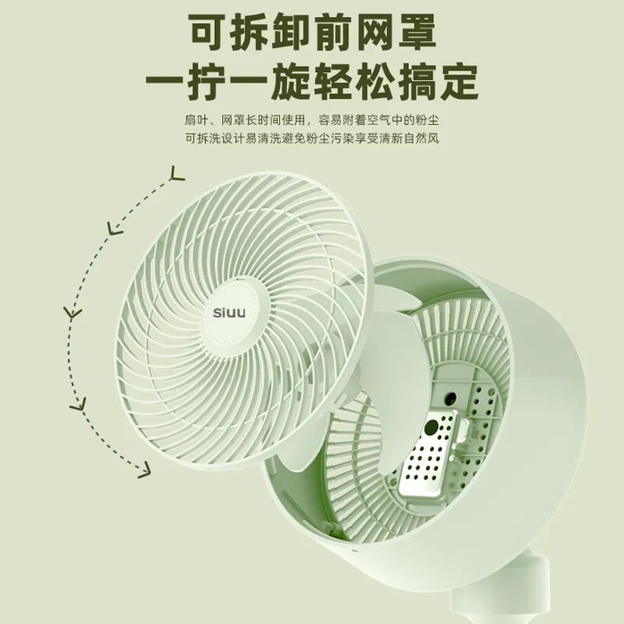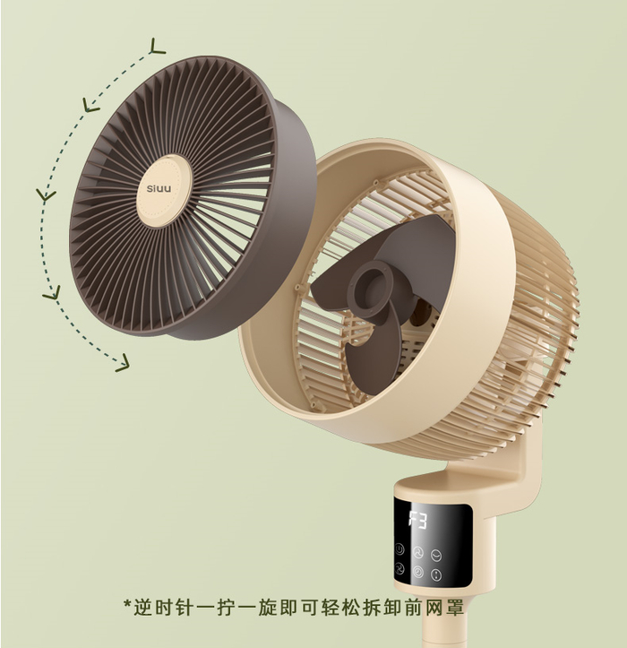 西佑循环扇的前网,是可以轻松拆卸的,前网逆时针旋出,可全身水洗,风扇保持干净,吹出的风才会更清爽干净。