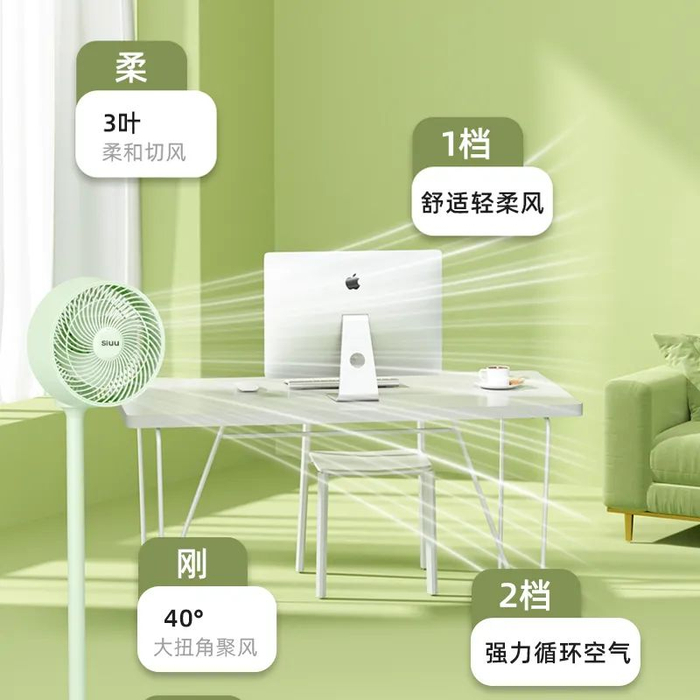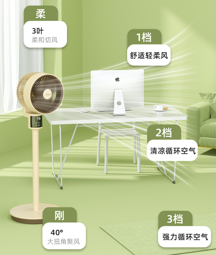 但如果搭配上循环扇,空调不用开太低,也能将空调的冷风吹散,让冷风更快也更柔和地遍布整个房间,更加接近自然状态下的降温。